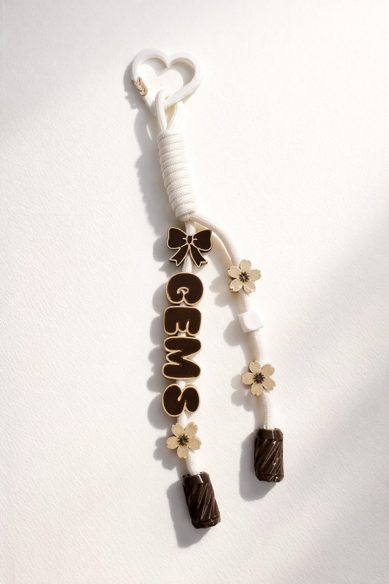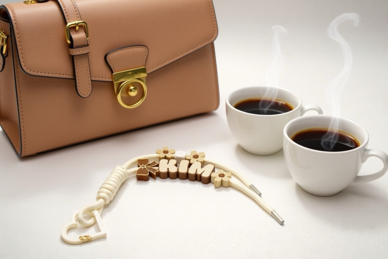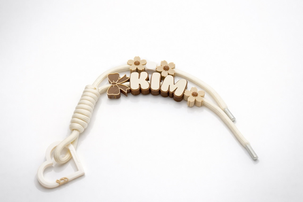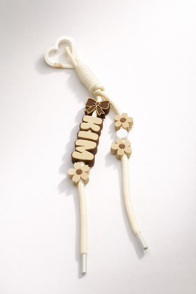 This custom name bag charm features soft cream cord detailing, warm mocha lettering, delicate floral accents, and a subtle bow for a timeless, elegant finish. Designed to complement handbags, totes, backpacks, and gift sets, each piece is customized with your chosen name for a look that feels uniquely yours.